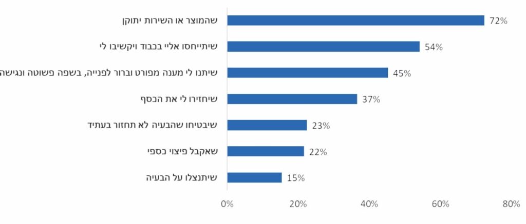 - הממצא החשוב ביותר שעולה מהסקר הוא שכאשר אנחנו מתלוננים, אחד הדברים החשובים ביותר עבורנו הוא שיתייחסו אלינו בכבוד ויקשיבו לתלונה שלנו – 55% מהצרכנים ציינו כי זו אחת הציפיות המרכזיות שלהם מהעסק כשהם מתלוננים על מוצר או שירות שרכשו.